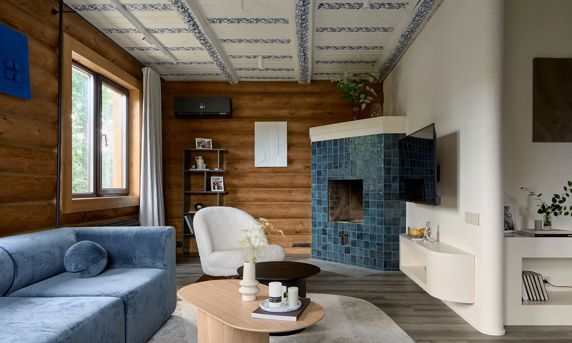 Чтобы сделать гостиную более обособленной, дизайнеры добавили простенок, который создал уютный уголок в доме. Камин, ранее казавшийся "потеряшкой" из-за своей формы, был доработан и стал центральным элементом комнаты. В оформлении интерьера появился микс «историчных» элементов — обилие дерева и акцентный делфтский узор, который лег в основу отечественной Гжели, — и современных плоских скругленных форм мебели. Этот стильный контраст придал помещению особый шарм .